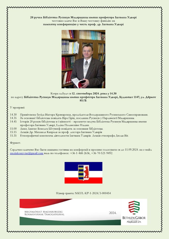 Бібліотека Русинів Мадярьска імени професора Іштвана Удварі в Будапешті, котра тот рік святкує 20-ый юбілей свого основаня, орґанізує у своїх просторах завтра 12-го септембра 2024-го року памятну конференцію на честь професора, по котрім має свою назву. На конференції будуть брати участь Віктор Крамаренко – председа Вседержавного русиньского самосправованя, під котре бібліотека належыть, і Віра Ґіріц – посланкыня за Русинів у Парламенті Мадярьска. Академік Іштван Удварі (14. юла 1950 р. – 9. новембра 2005 р.) окрім іншого од 1982-го року выкладав російскый, україньскый і русиньскый язык на Высшій педаґоґічній школі в Ніредьгазі, де у 1992-ім році засновав Катедру україньской і русиньской філолоґії, яка фунґовала до року 2013, пізніше была обновлена лем україністіка. Інтересовав ся аналізов русиньскых текстів, головно тых, котры односны суть ку періоду до 19-го столітя, і котры ся му подарило найти в мадярьскых архівах. Тыж приготовив до друку дакілько томів рукописів русиньского історіка Антонія Годинкы, репрітны выдань букваря Мануіла Ольшавского, букваря Іоанна Куткы і много далшых. Так само працовав над языком і літературов Русинів Войводины. Фото: Facebook/ Лем.фм(ЛЕМ.ФМ, Пкф)